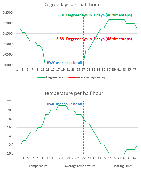 In the figures below the difference between calculating degreedays with a daily average temperature and a temperature measured each half hour is illustrated (for a specific weatherstation on a specific day). When the temperature measured each half hour rises above Indoor Temperature - Heating Limit the Degreedays will be 0. The difference in degreedays when using daily average temperture and the temperature measured each half hour is in this specific case 4.3%. When calculating the energy savings this difference can be of great importance in order to calculate the savings as exactly as possible.